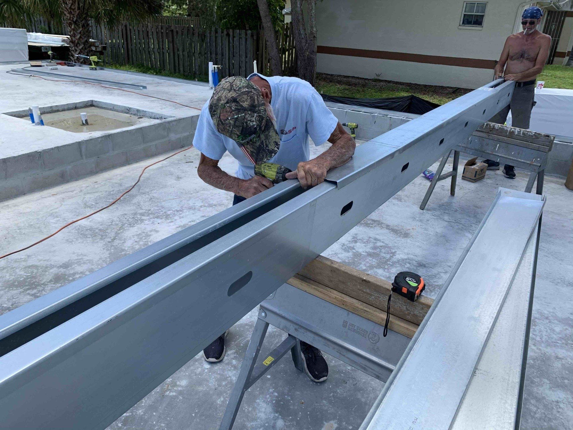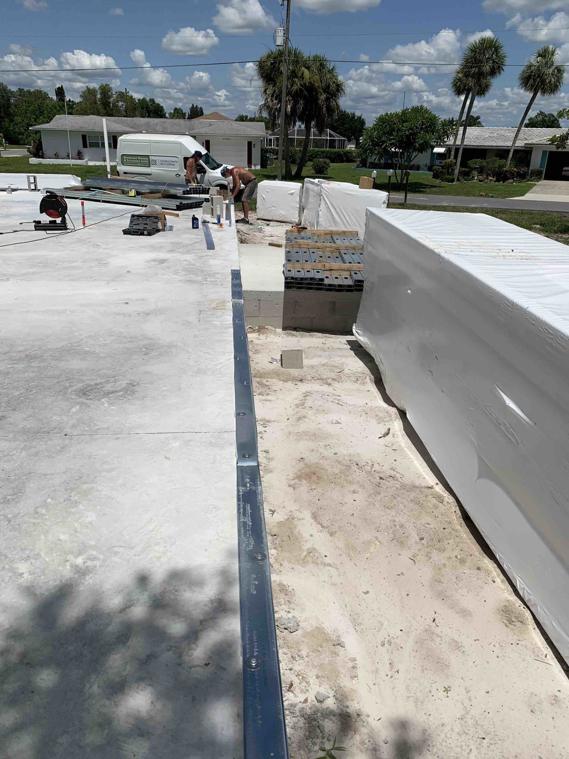 Construction has commenced on the lot with the completion of the slab on stem walls to comply with Charlotte County's 10-foot (above sea level) elevation requirements. Once the slab was poured and allowed to cure (for over 3 weeks), the workers had the product delivered and placed and began constructing the panel tracks on the slab while the center beam in the middle of the home was constructed out of 20-gauge steel with self-tapping screws. As of August 3, 2020, the walls and roof will be assembled and the entire house enclosed by August 10, 2020. This is the speed and ease of this type of steel SIPS construction, which has a 2-hour fire rating and promises an R-value of at least 60!
